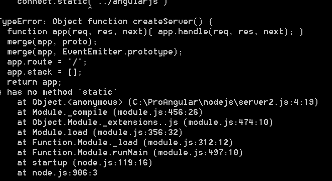 I run node server.js and I get “TypeError: Object function createServer(), has no method ‘static’”